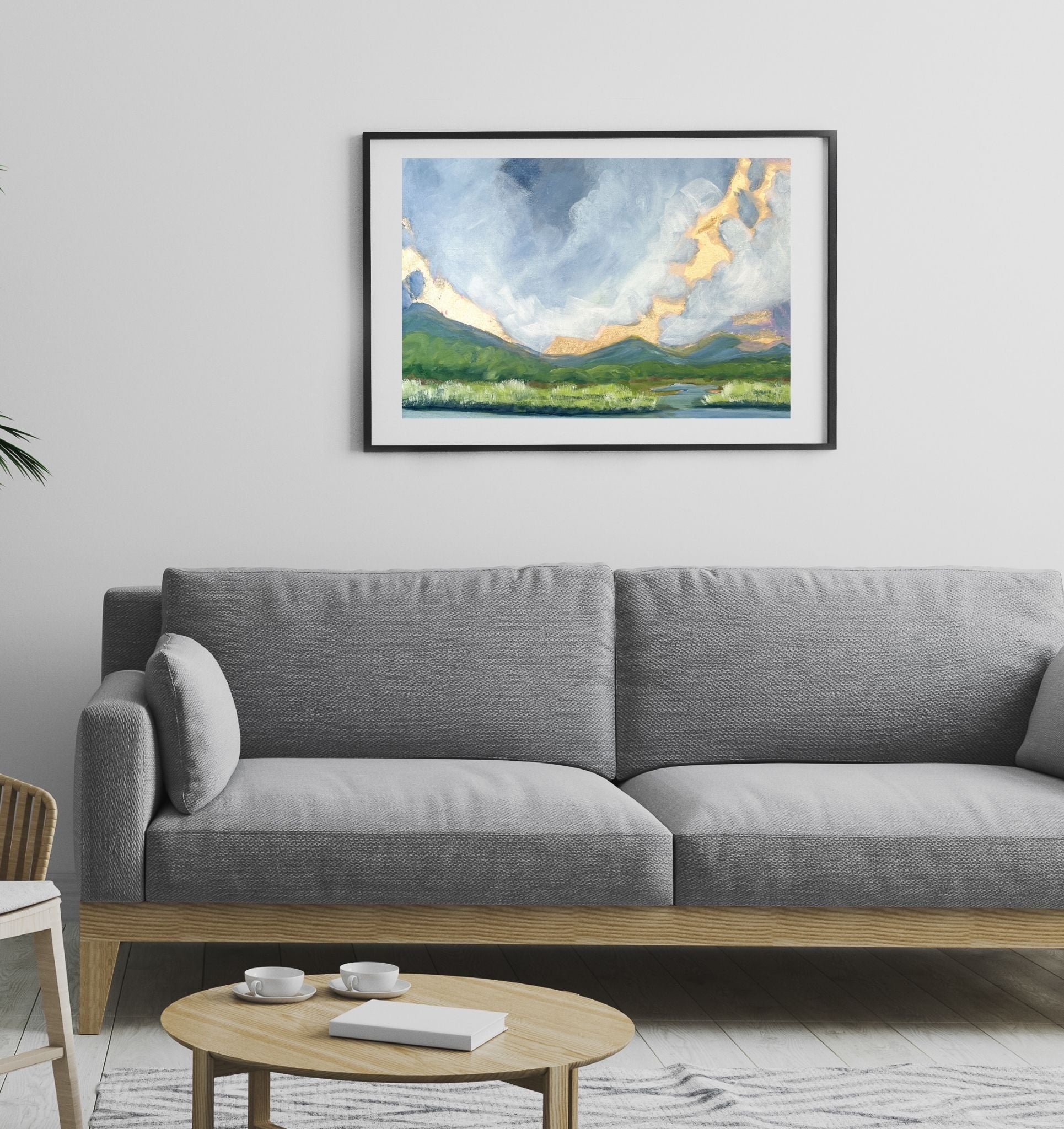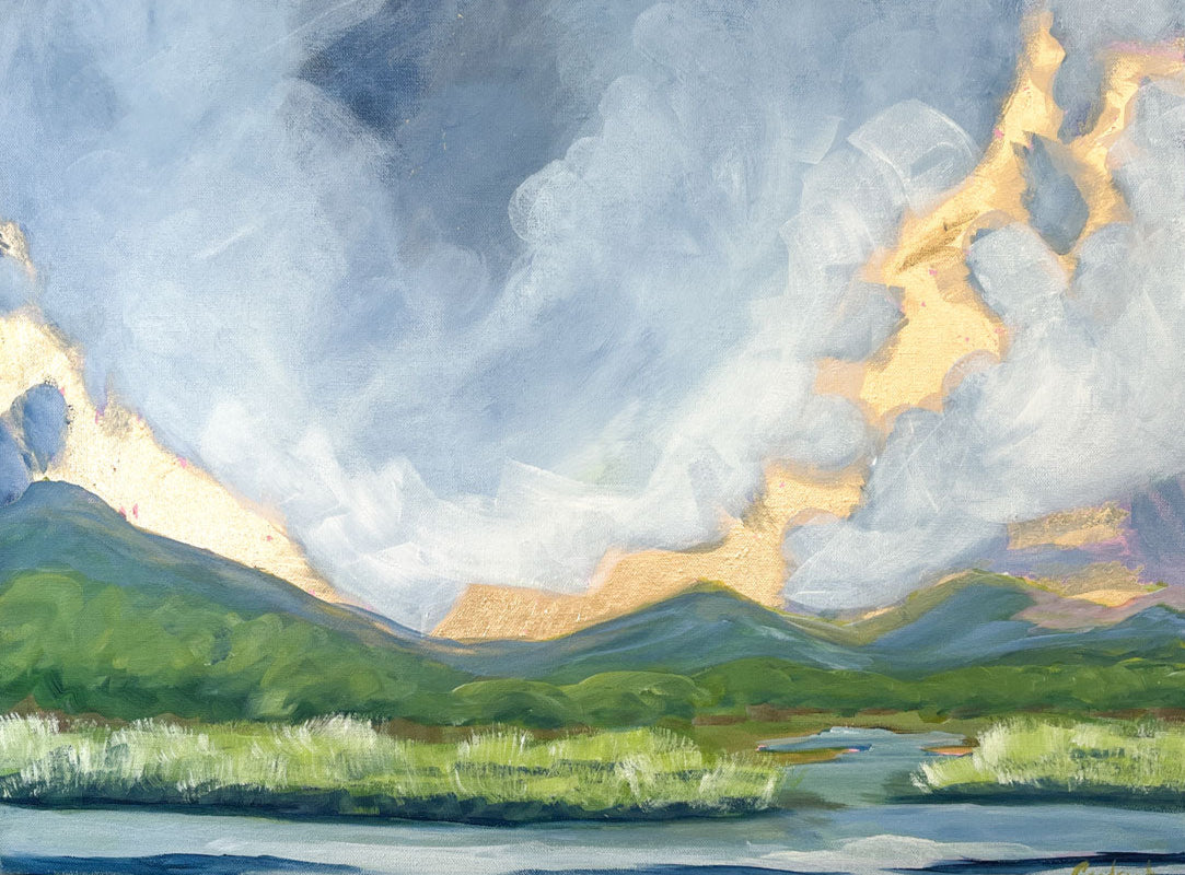 Blues, greens, and gold leaf evoke a sense of tranquility, while the dramatic sky and sunrise add a touch of magic.